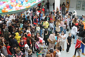 Astronauten, Drachen, Clowns, Bären und Monster tummelten sich am Dicken Donnerstag in der dritten und vierten Stunde in der bunt geschmückten Aula des Gymnasiums an der Heinzenwies. Wie jedes Jahr hatte sich die SV lustige Spiele zum Mitmachen für Schülerinnen und Schüler der Klassenstufen 5 bis 7 überlegt. Dazu spielten bekannte Faschingsschlager auf. Höhepunkt des Tages war die Prämierung des besten Kostüms. Viele fantasievolle Verkleidungen waren auf der Bühne zu bestaunen und die Wahl fiel sichtbar schwer. Schließlich gewann Carl Knapp aus der Klasse 5c den Kostüm-Wettbewerb mit seinem Dustin-Kostüm. Zum Abschluss regneten ein bunter Luftballonreigen und Süßigkeiten auf die Feiernden.