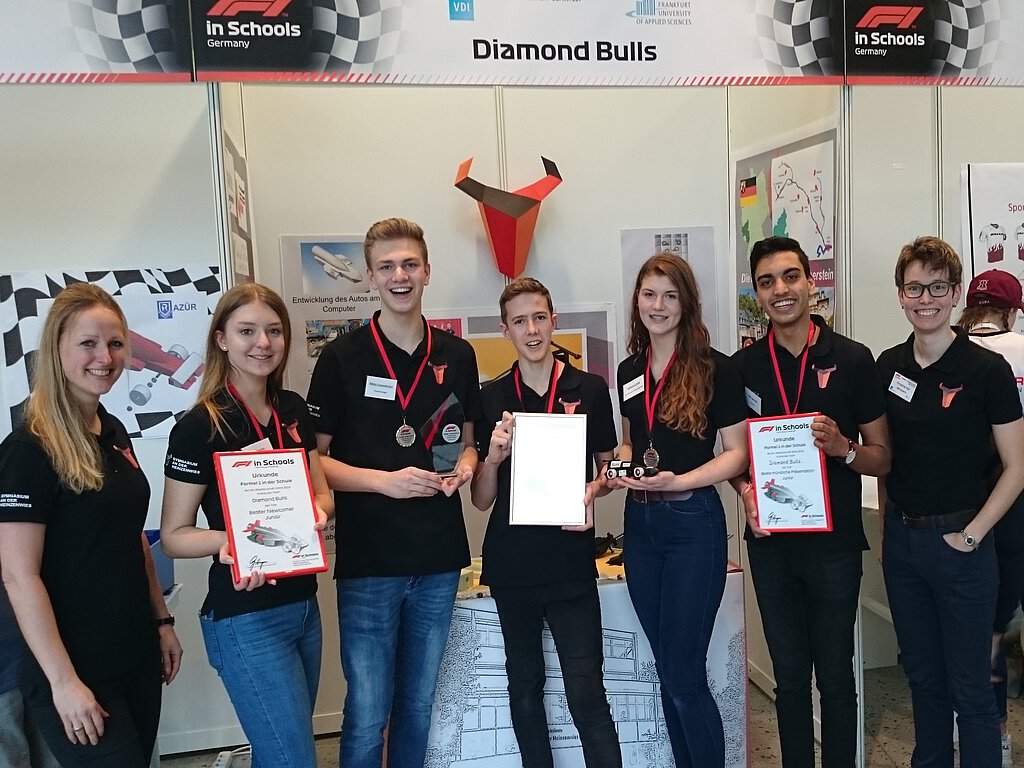 Wie die Nahe-Zeitung bereits berichtete, qualifizierte sich die Begabtenförderungsgruppe Physik des Gymnasiums an der Heinzenwies, bestehend aus den Neuntklässlern Yash Agrawal, Lea Brusius, Felix Heuser, Niklas Leyendecker und Katharina Wild, angeleitet durch ihre Lehrerin Christine Fell, im März bereits auf dem Regionalentscheid Mitte in Frankfurt für die Deutsche Meisterschaft von Formel 1 in der Schule. Hierbei handelt es sich um einen multidisziplinären Schülerwettbewerb. Die Teams müssen ein Miniatur-Formel 1-Auto konstruieren, fertigen lassen und damit bei Rennen antreten. Entscheidend ist die Teamleistung aus Konstruktion, Fertigung, Reaktionszeit, Fahrzeuggeschwindigkeit, Businessplan und Präsentation.