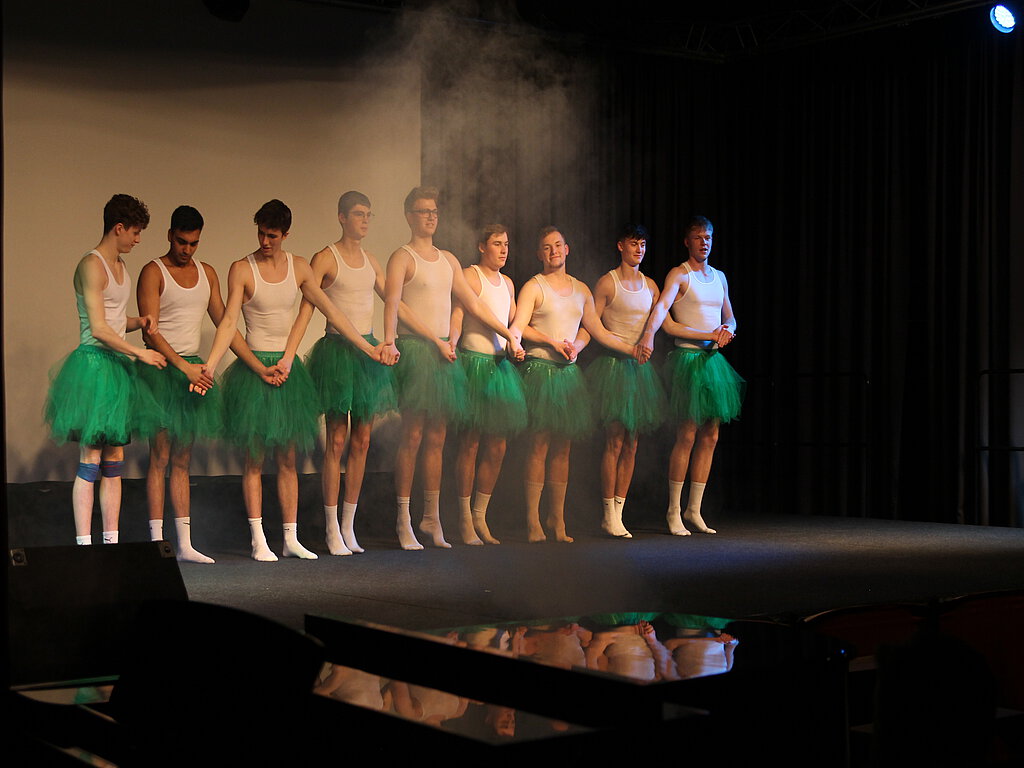 An welche Kinderserien aus Ihrer Kindheit erinnern Sie sich? Diese Frage stellte Moderator Florian Lindemann gestern Abend dem in der Aula des Gymnasiums an der Heinzenwies versammelten Publikum. Und so ließen die 13er bald Erinnerungen an die Serien ihrer Kindheit aufleben, hatten sie doch als Motto für ihren Showabend „Wie wir zu denen geworden sind, die wir heute sind“ gewählt. Kurz nach sieben begann der Showabend standesgemäß mit dem „Sandmännchen“, das samt Bobbycar über die Bühne sauste. Es folgten „Die Schlümpfe“ – präsentiert in einem kleinen Video des Geschichts-LK. Dann wurde „1, 2 oder 3“ gespielt – in einer Heinzenwies-Edition. Man musste schon Heinzenwies-Insider sein, um hier punkten zu können und Fragen wie „Welcher Lehrer verkuppelt gerne seine Schüler?“ oder „Welcher Lehrer liebt es, Schweigeminuten in seinem Unterricht zu machen?“ beantworten zu können. Und so hatten die Acts des Abends immer wieder Bezüge zu liebgewonnen Kindheitsserien – sei es, dass Anna Hoberg, Sofia Gellbling und Ayush Modi Kinderserien-Intros von „Die Biene Maja“ oder „Pippi Langstrumpf“ nachsangen oder dass eine grandiose Rope skipping-Vorführung von Sophia Backhaus und Lea-Sophie Kessler im Stile von Alvin und die Chipmunks stattfand. Tanz und Gesang wechselten mit Spielen, selbst gedrehten Videos und Sketchen. Für viele Lacher sorgte das Männerballett der Heinzenwies-Jungs, die „Schwanensee“ improvisierten. Danach zogen die Stufen-Damen mit einem sehr professionell einstudierten Tanz zu dem „The Kim Possible Song“ nach. Aus „Luke – die Schule und ich“ wurde „MSS 13, die Heinzenwies und ich“. Ein Lehrerteam und ein Schülerteam traten gegeneinander an, um herauszufinden, wer fitter fürs Abitur ist. Fragen rund um den Schulstoff in sich steigernder Schwere von der ersten bis zur 13. Klasse mussten beantwortet werden – und am Ende stand das Lehrerteam knapp als Gewinner da. Julius Rosenstiel, Felix Heuser, Connor Pick und Yash Agrawal rockten mit „Call me maybe“ die Bühne. Die Umbauphasen auf der Bühne überbrückte das Moderatorentrio Elina Hasenkampf, Katharina Wild und Florian Lindemann, das auf einem Sofa vor der Bühne Platz genommen hatte, immer wieder mit Plaudereien über die Schulzeit und bezog dabei auch das Publikum mit ein, in dem viele ehemalige Heinzenwieslerinnen und Heinzenwiesler saßen. So war es auch kein Wunder, dass bei dem Spiel „Vier Bilder – eine Person“, das auf der Leinwand nacheinander vier Fotos präsentierte, die auf einen bestimmten Lehrer oder eine bestimmte Lehrerin hinwiesen, alle Lehrer erraten wurden. Dann wurde es nach der Pause, in der die MSS 13 ihr Publikum mit Essen und Getränken versorgte, noch einmal musikalisch: Anna Hoberg und Ayush Modi präsentierten „High School Musical – Breaking Free“. Viel Applaus bekam auch der Heino-Verschnitt mit gleich fünf Heino-Sängern auf der Bühne, dargestellt von Jonas Meyer, Enzo Kullmann, Philipp Conradt, Felix Baier und Florian Lindemann, die den Heino-Schlager „El Zecho und Don Promillo“ zum Besten gaben. Angelina Klaus und Ayush Modi waren im Anschluss mit „Give it up“ zu hören. Natürlich durfte bei den Erinnerungen an Fernseherlebnisse aus der Kindheit auch „Let‘s dance“ nicht fehlen. Die Tanzpaare Anna Hoberg und Niklas Leyendecker sowie Lilly Hering und Leonie Strukov stellten sich hier einer kritischen Jury. Auch die Serie „Grey‘s Anatomy“ guckten wohl einige 13er mit großer Leidenschaft, denn nun wurde eine Szene auf der Bühne nachgespielt.