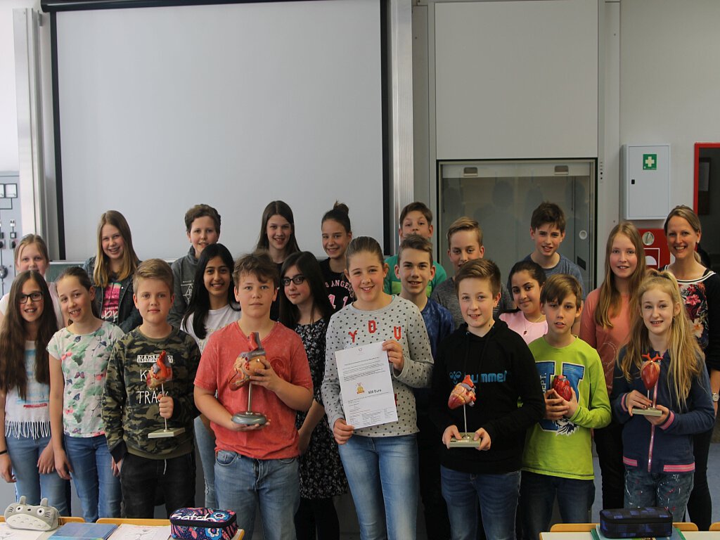 Die Klasse 6a hat zusammen mit ihrer Naturwissenschaftslehrerin Stephanie Kraemer im Rahmen der Kinderakademie Gesundheit der Stiftung Mainzer Herz an einem Wettbewerb teilgenommen und den ersten Preis gewonnen. Die Klasse erstellte die beste Präsentation zum Thema „Rauchen und Gesundheit“, eine „hervorragende und unglaublich vielfältige Präsentation“, wie es in dem Schreiben der Stiftung heißt. Besonders gut gefiel der Jury der Stiftung, dass die Schülerinnen und Schüler es sogar schaften, einen Zigaretten-Automaten zu versetzen, der zu nah im Bereich von Schulen angebracht war. Für ihre kreativen Ideen der Klasse gratulierte der 6a Professor Thomas Münzel von der Mainzer Uniklinik. Was sie mit den gewonnenen 500 Euro machen, diskutieren die Schülerinnen und Schüler noch.