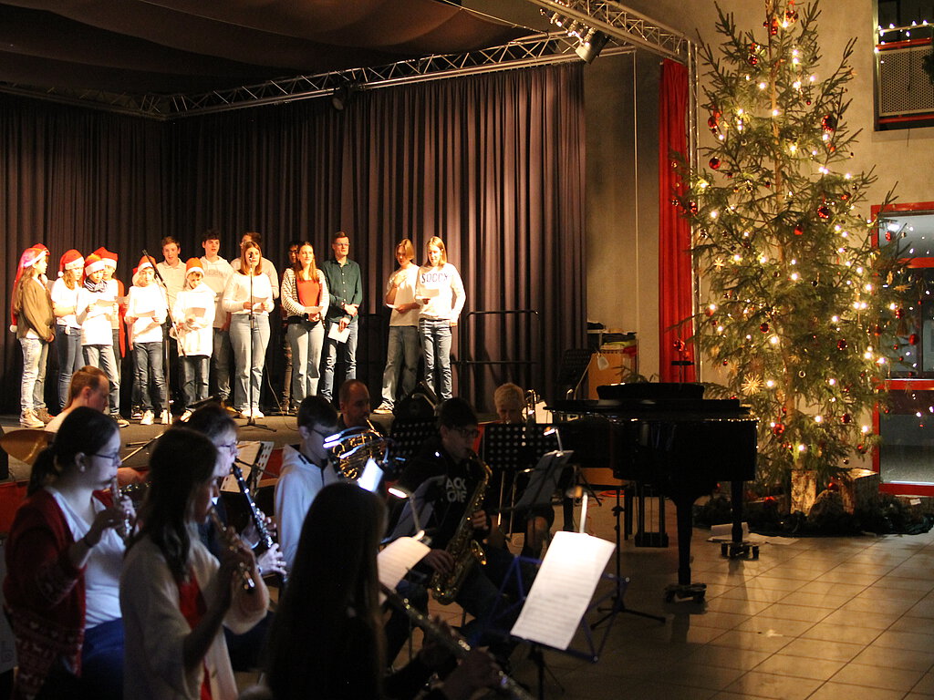 Mit dem Weihnachtslied „Adeste fideles“ aus dem 18. Jahrhundert läutete das neu zusammengestellte Schüler-Lehrer-Bläserensemble den Konzertabend ein. Es folgten drei Klassenbands der siebten Klassen mit weihnachtlichen Songs, die Musiklehrer Jörg Jungbluth mit den Schülerinnen und Schülern eingeübt hatte. Die Klasse 7a präsentierte ein englischsprachiges Weihnachtslied mit Gesang, akustischen Gitarren, E-Gitarre, E-Bass, Cajon, Trommel, Klavier und Violine. Die Parallelklasse 7b performte den Song „Last Christmas“ und die 7c zeigte den „Jingle Bell Rock“. Danach feierte das von Musiklehrerin Ursula Koch-Czepluch neu gegründete Gitarren-Trio Premiere und spielte „Morgen kommt der Weihnachtsmann“ zweistimmig und „Jingle Bells“ dreistimmig. Matthis Strack, Momo Gilcher, Sebastian Murphy, Maurice Korb, Maline Stahn und Amely Birck aus der Klasse 5d trugen anschließend die schöne Geschichte „Licht kann man verschenken“ vor. Danach war erneut das Gitarren-Trio mit einem Weihnachtslied zu hören. Musiklehrerin Tina Bußmann hatte mit der Klasse 8b den bekannten Weihnachtssong „All I want for Christmas is you“ eingeübt und wurde beim Vortrag von Musiklehrerin Anne Kröninger am Flügel begleitet. Dazu hatte die 8b einen unterhaltsamen weihnachtlichen Filmclip gestaltet, der darüber nachdachte, was Filmmusik alles bewirken kann. Trotz Kursarbeiten, Krankheitsfällen und extrem kurzer Probenzeit schaffte es der Musik-Grundkurs von Ursula Koch-Czepluch noch, passgenau das schöne altenglische Weihnachtslied „God rest ye merry gentlemen“ einzuüben. Das Lied ließ die Zuschauerinnen und Zuschauer die Kraft spüren, die schon von dem kleinen Jesuskind ausgeht. Für einen lebhaften Weihnachtstanz hatte sich die Klasse 6b entschieden, den sie nun inmitten von bunten Lichteffekten aufführte. Im Anschluss war erneut das Bläserensemble mit „Winterwonderland“ von Felix Bernard zu hören, das eine weiße Winterlandschaft mit Schlittenglöckchen, glitzernden Straßen und Kaminfeuer vor dem inneren Auge hervorzauberte. Die Musical-AG hatte sich für einen Liedbeitrag entschieden, der aktueller denn je war: Das Lied „Happy Xmas – War is over“ von John Lennon und Yoko Ono entstand einst als Protestlied gegen den Vietnamkrieg und entwickelte sich dann zu einem bekannten Weihnachtslied. Die Musical-AG widmete das Lied in diesem Jahr insbesondere den ukrainischen Mitschülerinnen und Mitschülern mit dem Wunsch, dass der Krieg in der Ukraine bald vorbei sein möge.
