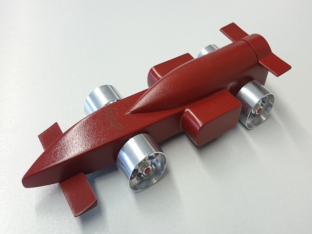 In Kooperation mit der Firma Automatendrehteile Römer aus Niederwörresbach wurden schließlich die Räder, Achsen und Radkappen gefertigt. Als Material wurde Alu gewählt, da der Raddurchmesser bei der Fertigung aus dem leichteren POM zu Problemen führte. Bereits im Vorjahr wurde die Qualität der Räder ausdrücklich durch die Jury gelobt, sodass die Grundform und die doppelte Keramikkugellagerung beibehalten wurde.