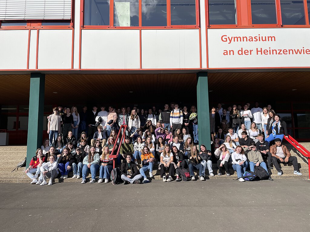 Am 10.04.2024, am Tag des Rückbesuches, trafen die französischen Gruppen gemeinsam mit ihren betreuenden Lehrkräften um 13:30 Uhr am Gymnasium an der Heinzenwies ein - die Wiedersehensfreude war groß. Nach einem gemeinsamen Mittagessen in der Aula der Schule zeigten die Gruppen ihren Partnern zunächst die Schule, bevor die letzten Gesangsproben in den Arbeitsräumen stattfanden.