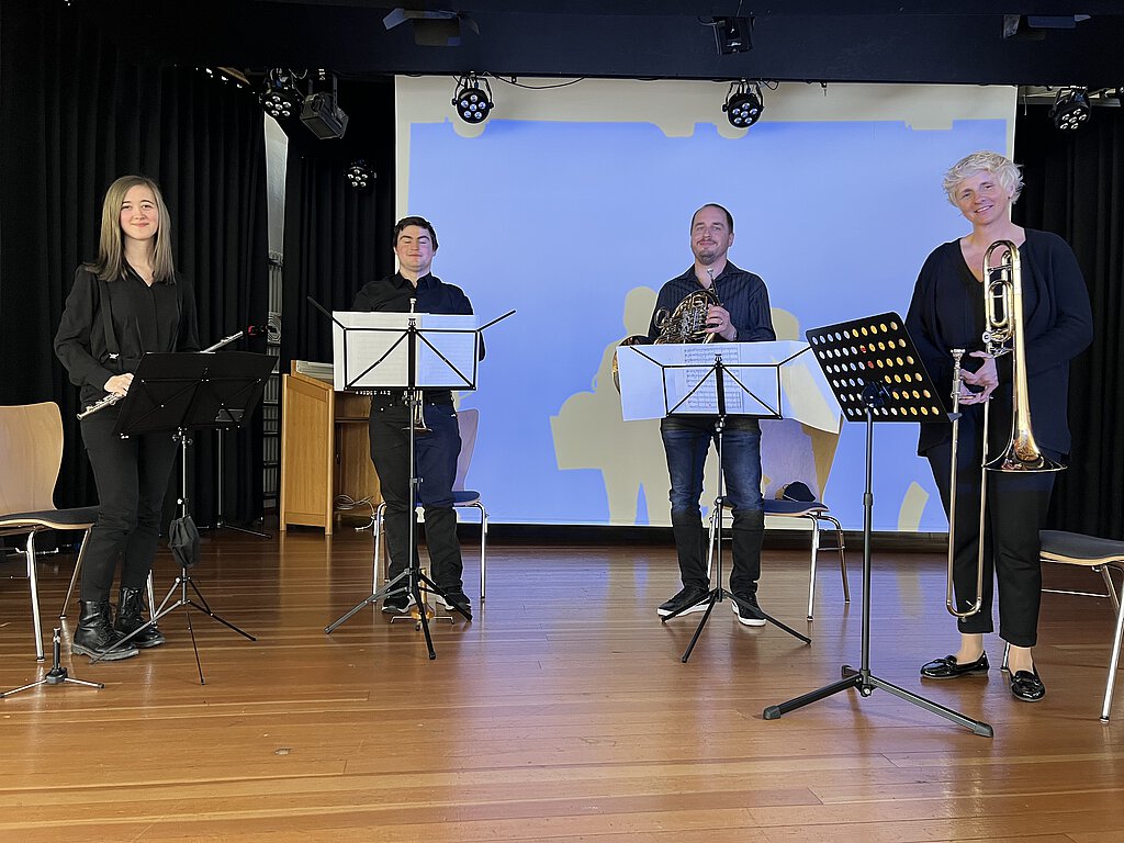 Auch für die musikalische Gestaltung der Preisverleihung, die am 4. Mai im Festhaus Winnweiler stattfand, sorgte die Heinzenwies. Das Bläserquartett unter Leitung von Musiklehrerin Anne Kröninger war mit drei Beiträgen zu hören: „Celebration of Spring“ von Felix Mendelssohn Bartholdy, „Which is he properest day to sing?“ von Thomas Arne und mit dem rheinischen Volkslied „Der bucklige Fischer“ nach einem Arrangement von Johannes Brahms.