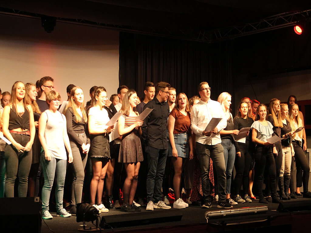 „Guten Abend. Hier ist die MSS 13 mit der Tageshow.“ – Mit diesen Worten begrüßten Luke Rothfuchs, Carolin Späth und Ricarda Schneider am vergangenen Wochenende ihr Publikum in der randvoll gefüllten Aula des Gymnasiums an der Heinzenwies. Zuvor hatte sich die sympathische Stufe 13 mit einem Augenzwinkern und kleinen Trailern den Zuschauern vorgestellt. Nach dem Wissen vor 8 und dem aktuellen Börsenbarometer, das die Kursübernahmen zu Schuljahresbeginn thematisierte und einem letzten Nachschminken durch die Maske startete ein unterhaltsames und abwechslungsreiches Programm, für das die Schülerinnen und Schüler in den vergangenen Wochen hart geprobt hatten. Nachdem eine Reportage die massiven Parkplatzprobleme rund um die Heinzenwies aufgedeckt hatte, waren Luke Rothfuchs und Emily Baumann, begleitet von Garvin Strube am Schulflügel, mit dem Song „Shallow“ zu hören. „Sport macht Schule“ – Neue Unterrichtsmethoden im Fach Sport thematisierte ein weiterer Videobeitrag, der eine entspannte, „In touch“-lesende Sportlehrerin und gestresste Schüler vorstellte. Nachdem die Tagesshow darüber berichten musste, dass einer Boygroup für ihre Schwanenseeinterpretation der Web Video Award verliehen wurde, schaltete man live zu Annika Puhl auf die Bühne. Sie präsentierte ihre Show „Schlag den Lehrer“, in der sich die Schülerin Lea Staudt und Erdkundelehrer Carsten Thiel ein Wettraten um die Hauptstädte der Welt lieferten. Ein Werbespot für die „Latzbux“ und das Leben der Jugend auf dem Land strapazierten die Lachmuskeln, bevor es ernst wurde. Ein Frauen-Flashmop trat an, um ein Zeichen gegen Donald Trump zu setzen und brachte Stimmung auf die Bühne. Nach einem Rückblick auf den Sportunterricht früherer Zeiten, in dem es durchaus frauenfeindlich zuging, und einem Auftritt der Kammermusikgruppe um Emily Baumann, Ricarda Schneider und Garvin Strube machten technische Probleme der Tagesshow zu schaffen. Doch natürlich wusste der Programmdirektor Abhilfe. Praktikant Rosé mit seiner Ukulele stimmte das Publikum auf die Köstlichkeiten während der Pause ein und bat darum, die Stufenkasse gut zu füllen.