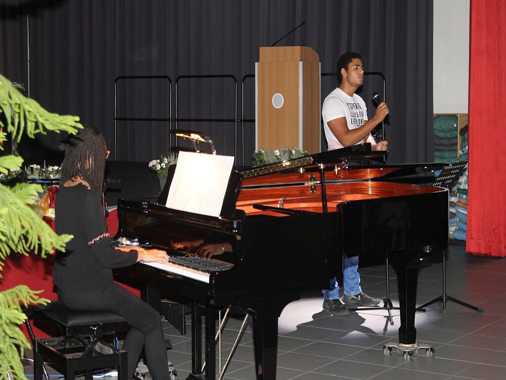 Nach einer Pause, in der das Publikum sich kulinarisch stärken konnte, sangen und spielten Christopher Smith und Sophie Maynard (MSS 13) den Song „Chandelier“ der australischen Sängerin Sia, der mit dem Lied der Durchbruch in den Charts gelang. Den beiden Schülern aus der MSS 13 galt auch ein besonderer Dank von Musiklehrerin Ursula Koch-Czepluch. Mit Christopher Smith wie auch Sophie Maynard, die im kommenden Frühjahr Abitur machen, spielten zum letzten Mal zwei langjährige und verdiente Mitwirkende des Kammermusikabends, zu dem die Fachschaft Musik mittlerweile im achten Jahr einlädt. Jazzfreunde kamen anschließend mit Glenn Millers Hit „In the Mood“, gespielt von Karl Dringelstein (8b) auf ihre Kosten. Danach wurde es romantisch, denn wer kennt nicht das weltbekannte Liebeslied „My heart will go on“ von Celine Dion aus der Titanic-Verfilmung von 1997? Sophie Gellbling (9a) präsentierte diesen Genuss am Klavier. Und noch einmal war das virtuose Können Garvin Strubes an diesem Abend zu hören: Die Jazzfassung von Edvard Griegs „In der Halle des Bergkönigs“ erntete viel Applaus. Mit dem letzten Beitrag des Abends wurde das Publikum in die Zeit der französischen Impressionisten versetzt: Claude Debussy veröffentlichte das Stück „Romance“ 1891. Lehrerin und Sängerin Gabriele Presser, die wieder von Garvin Strube am Klavier begleitet wurde, setzte mit dem mystischen Lied einen melancholisch-verträumten Schlusspunkt. Wieder einmal hatten die Anwesenden einen musikalisch überaus abwechslungsreichen Kammermusikabend erleben dürfen und den Musiknachwuchs der Heinzenwies kennen lernen können.