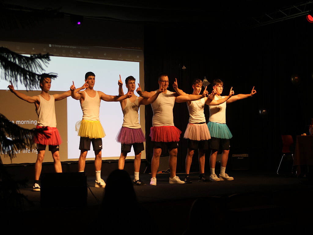 Eine Tanzgruppe nahm das Publikum anschließend mit durch eine temperamentvolle Reise durch die Songgeschichte der letzten Jahrzehnte. Nach der Pause, in der die Stufe ihre Gäste in dem festlich geschmückten Foyer bewirtete, waren die Mädchen der Stufe mit einem Tanz zu sehen, der sogar akrobatische Einlagen bot. Für romantische Stimmung sorgte der Beitrag von Anna Riotte und Lars Natus. Ein Video präsentierte die verschiedenen Lehrertypen – vom verzweifelten Referendar bis zur besorgten Klassenmutti. Der Höhepunkt des Abends war zweifellos das obligatorische Männerballett. In bunten Tutus sorgten die Stufenjungs für helle Begeisterung beim Publikum.