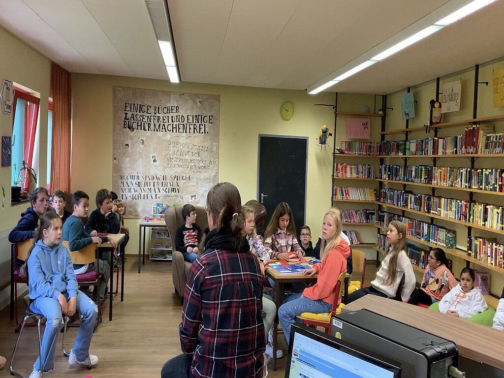 Gespannt verfolgten die Schülerinnen und Schüler die Einführung in die Nutzungsmöglichkeiten unserer Schulbibliothek. Nach einer Vorstellungsrunde mit dem Schwerpunkt der eigenen Leseerfahrung gab die Bibliotheksleiterin Frau Friesen einen Überblick über die thematischen Abteilungen der Orientierungsstufenbibliothek von „Spannung“ über „Abenteuer“ bis hin zu „Jungs“. Dann gab es Informationen zu den Modalitäten der kostenlosen Buchausleihe.