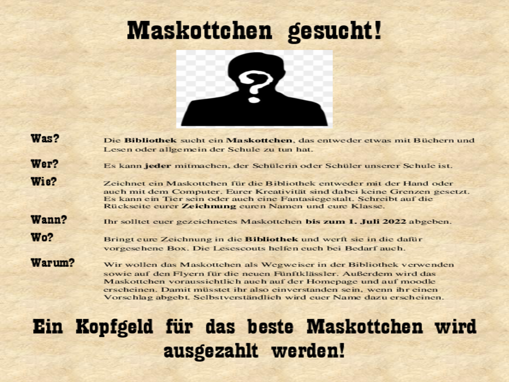 die Bibliothek sucht ein Maskottchen. und ist auf Eure Hilfe angewiesen.