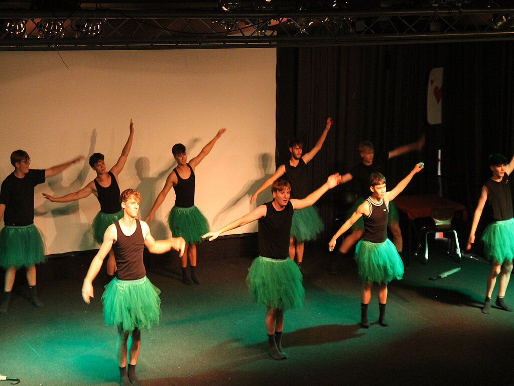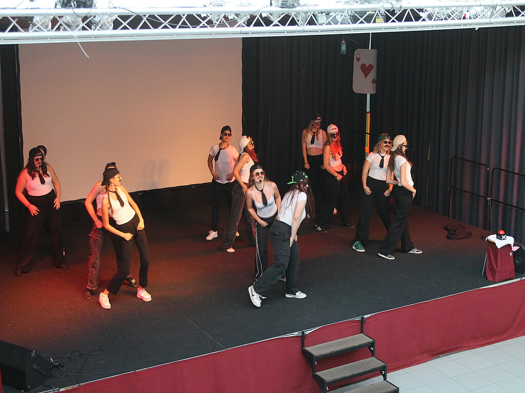 Der schwarze Wagen rollt langsam, aber zielsicher durch die rheinland-pfälzische Landschaft, sein Ziel: Bad Ems. Der Chauffeur öffnet vor dem illustren Spielkasino die Wagentür: Es steigen aus die beiden Moderatoren des Abends, Sarah Späth und Tristan Engel in Abendgarderobe, während augenzwinkernd ein Stufenkamerad als Hilfsarbeiter das Blumenbeet vorm Casino wischt. Und aus dem Auto geht es ins Casino, also direkt auf die Heinzenwies-Bühne, wo die beiden Moderatoren ein volles Haus begrüßen konnten. Ein Klassentreffen viele Jahre nach dem Abitur, man ist inzwischen alt geworden und blickt zurück auf die Schulzeit – so das selbstironische Rahmennarrativ einer kurzweiligen und unterhaltsamen Show, die mit zwei Gesangseinlagen startete. Isabel Werle und Hannah Schütz sangen „Shallow“ von Lady Gaga und Bradley Cooper, bevor das Duett zum Trio wurde und Englischlehrer Thomas Maldener sich singend durchs Publikum auf die Bühne dazugesellte. Mit dem Schlager „99 Luftballons“ von Nena sorgten die Drei für Stimmung, während im Hintergrund viele lustige Stufenfotos aufklickten. Und natürlich kein Klassentreffen ohne Erinnerung an Lehrerinnen und Lehrer und Kursgeschichten. In witzigen Videos wurde von den Eigenheiten der jeweiligen Kurse erzählt. Ganz in Schwarz tanzten anschließend die Stufen-Mädels auf die Bühne und schafften es, das gesamte Publikum zum Mitklatschen zu bewegen. Im zweiten Teil der Tanzeinlage verwandelten sich die Mädchen dann zu Schnurrbart und Krawatte tragenden Banditen mit Baseball-Cap, die ironisch ihre Männlichkeit zur Schau stellten. Wahr oder falsch, fragten im Anschluss Luisa Paulus und Linus Stephan. Lehrer-Schüler-Teams mussten aus vielen falschen Behauptungen über die Stufe die eine wahre These herausfischen, was zu heftigem Miträtseln im Publikum führte. Als wahr entpuppte sich tatsächlich auch die Behauptung, ein Schüler habe in einer Biologie-Kursarbeit statt Antworten auf die Fragen ein Gedicht an die Lehrerin geschrieben, mit dem er sein Nichtwissen charmant erklärte. Viele Lacher erntete besagter Schüler, als er auf der Bühne sein Gedicht vor versammeltem Publikum noch einmal vortrug. Und dann machte sich bei der Casino-Gesellschaft Hunger breit, Zeit für eine Pause, wie Luisa Paulus ankündigte. Nach der Pause, in der bei Swingmusik auch Zeit für Austausch mit ehemaligen Heinzenwieslerinnen und Heinzenwieslern war, für die der jährliche Showabend ein fester Treffpunkt ist, drehte sich das Glücksrad weiter. Weitere Videos stellten schmunzelnd die Stufe vor, bevor in grünen Tüllröckchen das Männerballett die Bühne eroberte und heftig beklatscht wurde. „Who’s the baby?“, fragten Alina Römer und Anna Hirsch dann zusammen mit Assistentin Lillith Stein beim Baby-Jackpot-Spiel. Wieder rätselten Lehrer-Schüler-Teams, wer aus der Stufe sich hinter den Babyfotos verbergen könnte, und wieder rätselte das gesamte Publikum gespannt mit. Ahs und Ohs begleiteten jeweils die Auflösung, die manchmal doch sehr überraschend war. Hochklassig akrobatisch wurde es beim Cheerleading. Unter Leitung von Leonie Gaer wurden auf der Bühne in atemberaubendem Tempo Menschenpyramiden gebaut, Purzelbäume in der Luft geschlagen und immer wieder neue Formationen gebaut. Etwas ruhiger ging es danach bei der Tombola zu. Bei der Ankunft hatten die Gäste Lose erwerben können, nun zog Sarah Späth nacheinander die Gewinner, während Tristan Engel die „außergewöhnlichen“ Preise überreichte. So gewann Oberstufenleiter Frank Becker eine pinkfarbene Perücke, die er auch sogleich anprobieren musste. Auch ein Starwars-Lichtschwert, eine Glühweintasse vom Bernkasteler Weihnachtsmarkt aus dem Jahr 2011 oder ein Set Teelichthalter konnten gewonnen werden. Zum Abschluss des rundum gelungenen Abends versammelte sich die gesamte Stufe in Casino-Abendgarderobe auf der Bühne und bedankte sich bei allen, die ihr bei der Organisation des Showabends geholfen hatten, vor allem bei Stammkursleiter Thomas Kuhn und bei Samuel Kuhn aus der Klasse 9b, der die Technik des Abends verantwortet hatte.