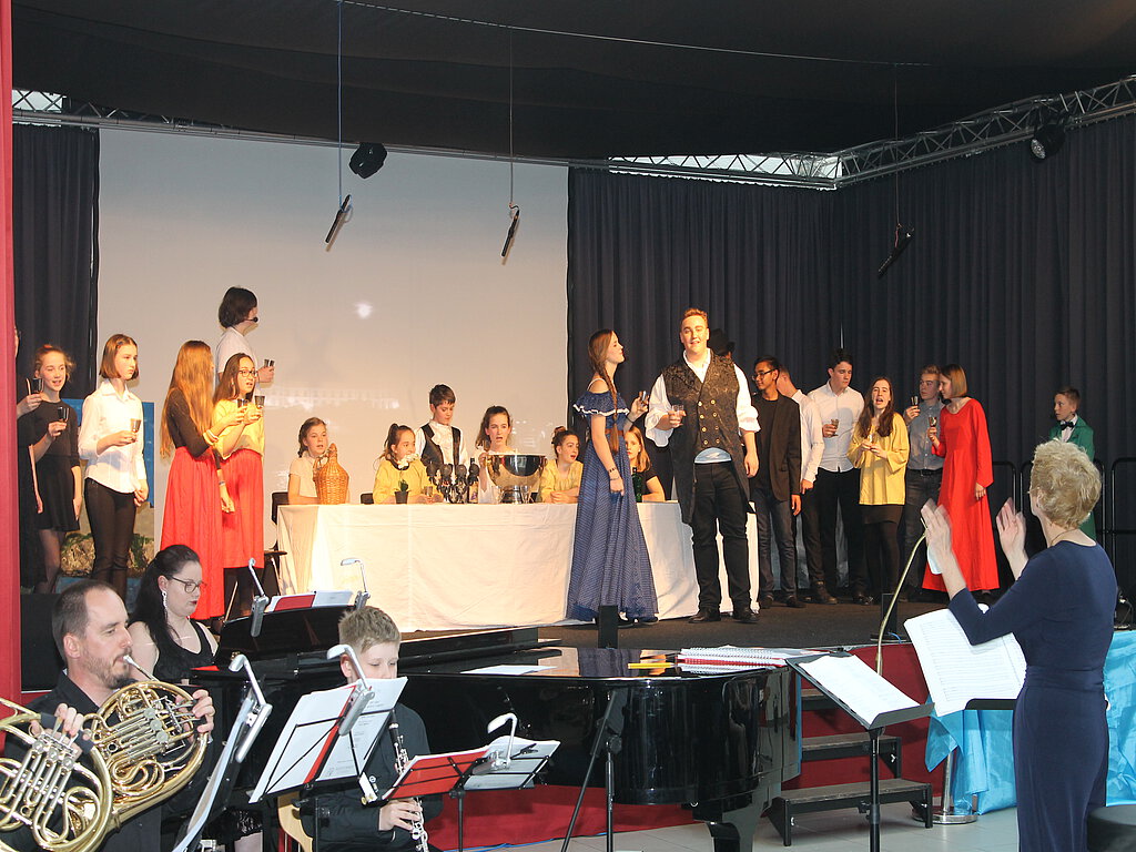 In seinem Verlies begegnet Edmond währenddessen Abbé Faria, den Jannis Ruhk mit glasklarer Stimme singt. Die beiden werden Freunde und graben gemeinsam an einem Tunnel, um zu entkommen. Doch Faria stirbt zuvor und Edmond gelangt in dessen Leichensack die Flucht. Der sterbende Faria hatte ihm noch das Geheimnis eines versteckten Schatzes auf einer kleinen felsigen Insel namens Monte Christo verraten. Auf einem Schmugglerschiff gewinnt Edmond einen neuen Freund – Jacopo (Viktor Bäcker). Mit seiner Hilfe hebt er den Schatz und wird unermesslich reich: Edmond nennt sich fortan Graf von Monte Christo und startet seinen Rachefeldzug. Eindrucksvoll schwört Edmond vor einem Bild lodernden Feuers, seine Feinde zu vernichten. Dies geschieht nach der Pause, in der die MSS 11 die Besucher mit Getränken und Snacks versorgt hat. In der Heinzenwiesaula ist es mittlerweile dunkel geworden, die richtige Kulisse für Edmonds unerbittliche Rache. Jacopo ist mit Neuigkeiten aus Paris heimgekehrt: Mercédès ist mit Mondego verheiratet, sie haben einen Sohn – Albert (Colin Kuntz). Edmond lässt ihn entführen und befreit ihn dann. Das ist seine Eintrittskarte in die noble, dekadente Gesellschaft, die die Schülerinnen und Schüler gekonnt in Szene setzen. Fortan lieben alle das Geld des unbekannten Grafen von Monte Christo und tanzen nach seiner Pfeife. Der aber lehnt ein sattes Leben mit seinen Reichtümern ab und will Gerechtigkeit. Er entlarvt Gier und Neid und schlägt seine einstigen Gegner mit ihren eigenen Waffen. Mercédès, die ihn zunächst nicht erkannt hat, offenbart sich Edmond schließlich und verzichtet auf ein Duell mit ihrem Sohn. Bei einem leuchtenden Vollmond (in und auch außerhalb der Heinzenwiesaula) kommt es zu einem furiosen Finale. Ein Schwertkampf zwischen dem Mondego und dem Grafen von Monte Christo spinnt sich an. Es ist zugleich das Abschiedsgefecht zwischen Richard Brunk und Christopher Smith, die über viele Jahre das Musical an der Heinzenwies geprägt haben. Nach ihrem Abitur im März sind sie noch ein letztes Mal für die Aufführung auf die Heinzenwiesbühne zurückgekehrt. Mondego wird erstochen, aber Edmond und Mercédès finden endlich zusammen. Mit eher melancholischen und nachdenklichen Tönen endet ein Musicalabend an der Heinzenwies. Die vielen ganz jungen Musicaltalente werden nun in die Fußstapfen der großen hineinwachsen müssen. Dass aber auch ehemalige Musicalmitwirkende der AG über die Schulzeit hinaus verbunden bleiben, zeigten Viktoria Ambrosius-Eichner und Hanna Dries, die auch noch Jahre nach dem eignen Abitur, in diesem Jahr im Orchester mitspielten.