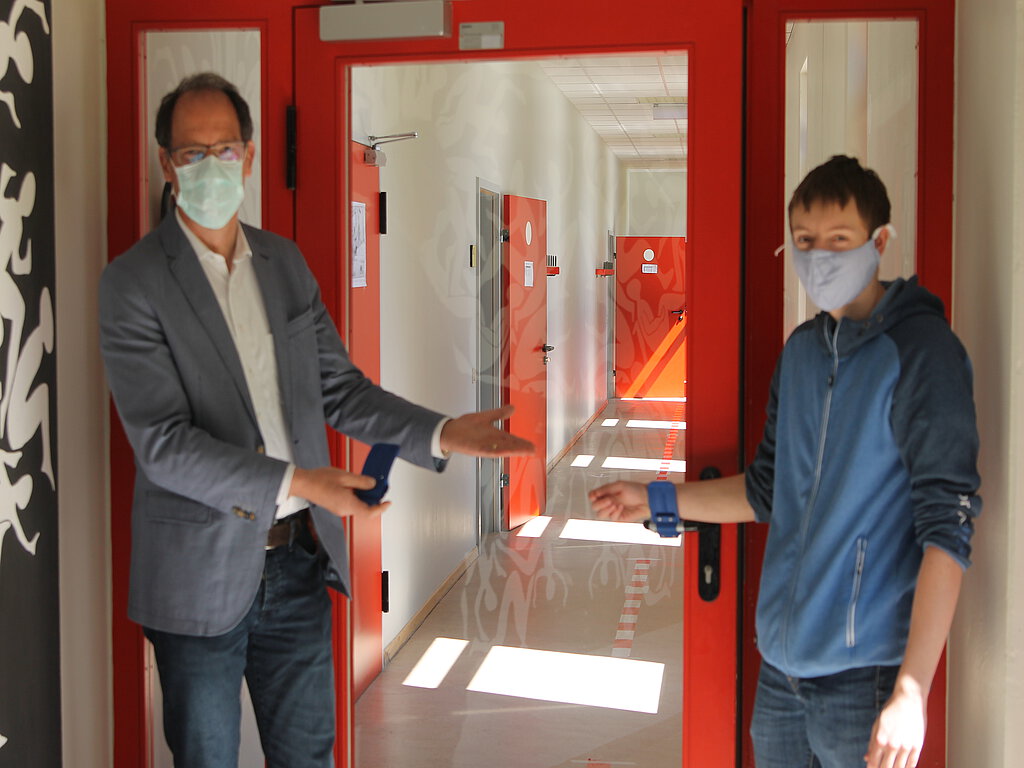Seit Montag sind die Schülerinnen und Schüler der Stufen 10, 11 und 12 zurück an der Heinzenwies und gehen sehr diszipliniert mit den neuen Hygienevorschriften um. Dass sie aber auch selbst mitdenken und eigene Ideen zum Schutz vor Ansteckung mit dem Coronavirus entwickeln, bewies Simeon Stürmer aus der MSS 12. Als er hörte, dass sich in der Schule ein Problem stellte, lieferte er nicht nur die Idee, sondern auch die Lösung: Im Neubau gibt es Zwischentüren, die sich nur durch Ziehen öffnen lassen und daher von jeder Schülerin und jedem Schüler mit der Hand angefasst werden müssen – ein möglicher Übertragungsweg für das Virus, wie Schulleiter Frank Huck festgestellt hatte. Permanent offen stehen dürfen besagte Türen aber nicht, da es Feuerschutztüren sind. Also überlegte der pfiffige Oberstufenschüler eine Lösung: Er maß den Türgriff aus und erstellte mithilfe eines Internettools im 3D-Drucker eine Vorrichtung, die er über dem Türgriff montierte. So kann die Tür nun ohne Berührung mit der Hand durch das Anziehen mit dem Arm geöffnet werden. Eineinhalb Stunden braucht der Schüler für die Herstellung einer solchen Vorrichtung. Trotz des Zeitaufwands hat er für alle Zwischentüren nun solche Halterungen hergestellt, wofür ihm alle Heinzenwiesler sehr dankbar sind. Schulleiter Frank Huck bedankte sich ausdrücklich bei Simeon und lobte ihn für sein Mitdenken – ein Beispiel dafür, dass die Coronakrise auch neue Kreativität freisetzen kann.