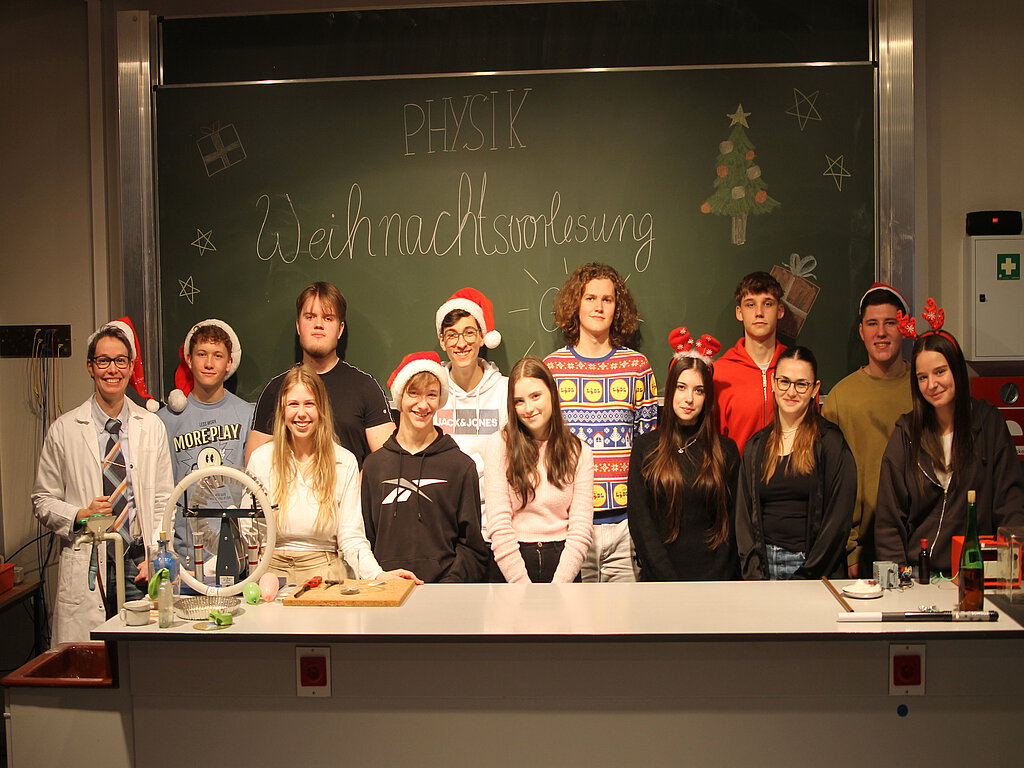 Auch das Weihnachtsfest 2023 musste der große Albert Einstein retten, da der Weihnachtsmann erkrankt war. Physiklehrerin Christine Fell, die die beliebte Weihnachtsvorlesung seit 2014 organisiert, hatte auch in diesem Jahr zusammen mit dem Physik-Grundkurs der MSS 12 ein tolles Programm auf die Beine gestellt: Die kleinen Zuschaurinnen und Zuschauer waren begeistert und passten ganz genau auf. Sie freuten sich mit den „Großen“, wenn die Versuche klappten. Als eine Tasse zu Boden rauschte und erst kurz vorm Boden stoppte, konnten sich nur noch die wenigsten auf den Stühlen halten, vor Staunen und Verwunderung. Besondere Highlights, die von vielen Ahs und Ohs begleitet wurden, waren wie immer die tanzenden Sterne und die RakeTEE, bei der ein Teebeutel zur Silvesterrakete wird. Und als die Glühbirne mit dem Feuerzeug angesteckt wurde, wurde gleich getuschelt, wo da der Trick ist, so was ginge nämlich gar nicht. Auch wenn die Fünftklässler befanden, dass ein Schokokuss, sei er noch so riesig, nicht für alle als Weihnachtsmenü reiche, so waren sich doch am Ende alle einig, dass die physikalische Weihnachtsvorlesung wieder einmal ein gelungener Abschluss vor den Ferien war. Und so sangen und pfiffen alle gemeinsam zum Abschluss das Weihnachtslied „Jingle Bells". Bei der anschließenden Diskussion, welcher Versuch am spannendsten war, konnten die Fünfklässlerinnen und -klässler keine Einigung erzielen. Der Physik-Grundkurs war froh und erleichtert, dass alle Versuche gut klappten und dass es gelungen war, den Kindern ein Strahlen aufs Gesicht zu zaubern.