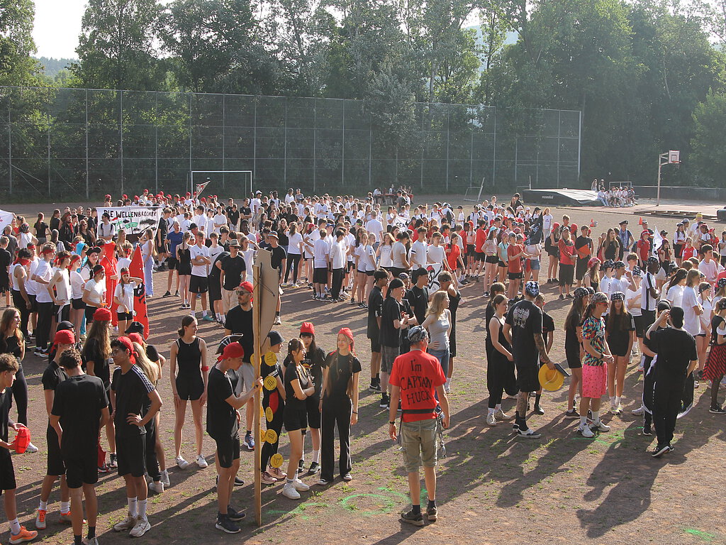 Der Wettergott hatte ein Einsehen: Bei nicht mehr ganz so heißen Temperaturen wie am Vortag, aber Sonnenschein starteten die „Pirate Games“ an der Heinzenwies. Schon beim Einzug der Klassen auf den Sportplatz wurden Totenkopfflaggen geschwungen, Piraten mit Augenklappen rasselten mit ihren Säbeln und Piratenbräute schwangen ihre weiten Röcke. Die einzelnen Klassen hatten im Vorfeld viel Mühe und Zeit investiert, ein einheitliches Outfit zu entwerfen, eine eigene Flagge zu kreieren und sich einen passenden Namen zu geben. Da wurden Nachmittage lang T-Shirts bedruckt und Fahnen mit fantasievollen Bildern bemalt. Das Ergebnis konnte sich sehen lassen: Sogar ein zum Piratenschiff umgebautes Bobbycar samt Pirat wurde über den Schulhof gezogen. Und so hatten es die Schiedsrichter nicht leicht: Wer hatte das schönste Outfit, die kreativsten Ideen? Denn natürlich wurde beides bewertet. Nach dem Start mussten alle Klassen einer Stufe gegeneinander antreten und sechs abwechslungsreiche Sport- und Spielstationen durchlaufen. Da mussten Münzen geworfen, Goldschätze im Sand ausgegraben oder Wasser per Schwamm über eine lange Wegstrecke transportiert werden. Kanonenkugeln galt es, in einer langen Schülerkette möglichst schnell weiterzugeben. Richtig piratenmäßig wurde es, als es galt, auf dem Beachvolleyballfeld die gegnerische Flagge zu rauben. Und auch eine Kreativaufgabe gab es: Aus dem Off hörte jede Gruppe die Erzählung von der Meuterei auf der Bounty. Dann ging es auf den neuen Soccer Court, wo die Szene detailgetreu nachgestellt werden sollte. Am Schluss wurden die Punkte zusammengezählt. Doch bevor es zur Siegerehrung ging, spielte noch die Bulls League ihr Endspiel. Und dann verkündete Sportlehrer und Organisator Dennis Kaucher kurz vor 13.00 Uhr die einzelnen Stufensieger. Die MSS 12 begleitete den Tag kulinarisch, briet an der Grillhütte Würstchen und sorgte für ausreichend Getränke und Snacks.