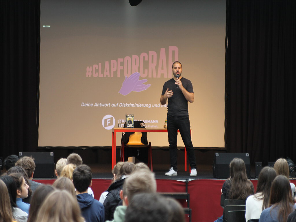 Seit Juni dieses Jahres ist die Heinzenwies „Schule ohne Rassismus –Schule mit Courage“. Da die Schule dieses Motto aktiv leben möchte, lud Initiatorin Anne Kröninger den Rapper Ben Salomo ein, der derzeit mit der Friedrich-Naumann-Stiftung durch Deutschland reist, um im Namen von #CLAPFORCRAP für eine offenen Gesellschaft zu werben, in der Herkunft, Religion und Geschlecht keine Rolle spielen. Die Stufen 8 bis 11 sahen zunächst das Video der aktuellen Kampagne, das deutlich macht, wie sehr Rassismus im Alltag der deutschen Gesellschaft verwurzelt ist. Salomo, der selbst Jude ist, berichtete den Schülerinnen und Schülern, wie er selbst in seiner Jugend mit Antisemitismus konfrontiert wurde. Erschüttert lauschten die Schülerinnen und Schüler seinem Bericht von einer Party in Berlin, wo er gefragt wurde, ob er die „jüdische Nationalhymne“ kenne. Daraufhin habe man ihm ein Gasfeuerzeug unter die Nase gehalten. Schockiert habe er realisiert, dass viele Freunde und Bekannte dies mitbekommen, aber nicht reagiert hätten. Er beschrieb seine Trauer und seinen Ekel über einen solch menschenverachtenden Antisemitismus, der wieder in Deutschland zu bemerken ist. Weiter erzählte er die Geschichte seiner Familie, die in der Ukraine im Ghetto leben musste, und klärte die Schüler über die Gräueltaten der Nazis auf. Auch die gegenwärtige deutsche Gesellschaft wurde thematisiert. Anschließend durften die Schülerinnen und Schüler Fragen stellen und mit Salomo diskutieren. Auch eine Vereinbarung wurde zwischen den Heinzenwieslern und Ben Salomo getroffen: Ab sofort versprechen die Heinzenwiesler, konsequent zu intervenieren, sollten sie irgendeine Form von Diskriminierung mitbekommen. Zum Abschluss performte der Künstler zur Freude aller einen seiner Raps und blieb geduldig noch lange vor Ort, um Autogramme zu geben, Fragen zu beantworten oder Selfies zu machen.