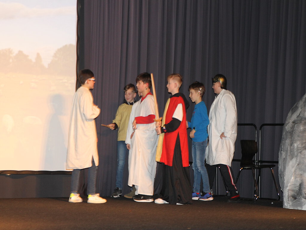 Eine römische Taverne begrüßte die Besucherinnen und Besucher des ersten gemeinsamen Sprachenabends der Fremdsprachen Englisch, Französisch und Latein am Gymnasium an der Heinzenwies. Da konnten Köstlichkeiten wie dulcia domestica (gefüllte Datteln), ova elixa (gefüllte Eier) iscia omentata (Hackfleischbällchen), nach original römischen Rezepten selbst hergestellt, verkostet oder römische Spiele ausprobiert werden. Natürlich konnte man sich auch einfach zum Plaudern niederlassen. Und offenbar waren viele Besucherinnen und Besucher neugierig geworden: Kurz vor Start des Bühnenprogramms um sieben Uhr mussten noch zusätzliche Stühle gestellt werden, da die Aula aufgrund des großen Besucherandrangs aus allen Nähten platzte. Dann endlich konnte die Klasse 6b mit „Le rapp des copains“ das kurzweilige Bühnenprogramm eröffnen. Die Delf B1-AG stellte anschließend den in Frankreich beliebten Königskuchen, den „galette des rois“ vor. Wer in dem aus Blätterteig und Marzipan bestehenden Kuchen ein Porzellanfigürchen findet, wird zur Königin oder zum König gekrönt. Gleich vier Königinnen und Könige konnten an diesem Abend gefunden werden. Mit dem amüsanten Lied „There’s a hole in my bucket“ der Klasse 6c ging es weiter, bevor die Französisch-AG das bei französischen Kindern sehr beliebte Volkslied „Jean Petit qui danse“, begleitet von Sofia Gellbling am Klavier, präsentierte. In rascher Folge konnten die beiden Moderatoren des Abends, Caroline Späth und Luke Rothfuchs (beide MSS 13), die abwechslungsreichen Beiträge ankündigen: Die Delf A1-Gruppe nahm das Publikum mit in den Louvre und demonstrierte in einem lustigen Sketch, dass Mona Lisa in Frankreich vollkommen unbekannt ist – die geheimnisvolle Schöne heißt hier „La Jaconde“. Die Lachmuskeln strapazierte auch die Klasse 7b mit dem Sketch „The cold“, übersetzt „Die Erkältung“. Auf einer Zugfahrt nach London findet sich eine bunte Truppe Reisender zusammen, die einem erkälteten Zuggast Tipps gibt – bis auf einen: Der ist Arzt und weiß, dass man gegen „the cold“ nichts machen kann. Die Lateingruppen entführten anschließend ins vorantike Rom und spielten auf der Bühne den Gründungsmythos Roms nach. Danach fanden sich die Zuschauerinnen und Zuschauer erneut im heutigen Frankreich wieder, nämlich auf dem Bahnhof. „Quelle heure est-il?“, wollte ein Bahnreisender wissen und bekam prompt die falsche Antwort. Auch die Schülerinnen und Schüler der Delf A2-AG, die den typischen Franzosen suchten, hatten zunächst keinen Erfolg. Erst derjenige, der am wenigsten typisch französisch wirkte, entpuppte sich als der echte Franzose. Seine Empfehlung „Amusez-vous bien“ galt auf jeden Fall für den Abend, der schließlich mit der Verleihung der erworbenen Sprachzertifikate seinem Höhepunkt zustrebte: Englischlehrerin Kathrin Luthmann stellte zunächst noch einmal das Cambridge Certificate vor, für das das Gymnasium an der Heinzenwies seit fünf Jahren Vorbereitungskurse anbietet und das weltweit abgelegt werden kann. Dann überreichte sie den Schülerinnen und Schülern, die im vergangenen Jahr die Prüfung bestanden haben, ihr Zertifikat. Ebenso präsentierte Französischlehrerin Anne Neelsen das Delf-Zertifikat, das „diplome d’etudes en langue française“, dessen mündlicher Teil vor Ort an der Schule abgelegt werden kann, die schriftliche Prüfung erfolgt am Institut Français in Mainz. Hierbei werden verschiedene Niveaustufen unterschieden. Auch alle Schülerinnen und Schüler, die im zurückliegenden Jahr eine der Niveaustufen erfolgreich abgeschlossen hatten, erhielten ihre Testate und reichlich Beifall. Auf jeden Fall zeigte der Abend, dass es viel Spaß machen kann, Fremdsprachen zu erlernen und andere Länder zu erkunden.