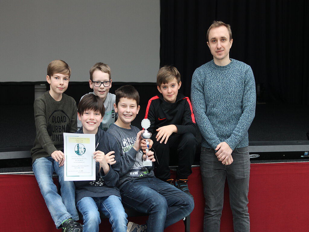 Bereits um 7.15 Uhr machten sich am vergangenen Mittwoch neun Heinzenwiesler mit ihrem Lehrer Willi Kujat auf den Weg zu der Schulschachmeisterschaft 2018/2019 im Bezirk Trier. In der Wettkampfklasse IV blieben Elias Cullmann, Patrick Ehrlich, Steward Giss, Ryan Hanson und Nico Dreher ungeschlagen und belegten unter 13 angetretenen Mannschaften den zweiten Platz. Damit qualifizierten sich die Heinzenwiesler für den Landesentscheid. Sie brachten den gewonnenen Pokal mit zurück zur Heinzenwies und präsentierten ihn ihren Klassen.