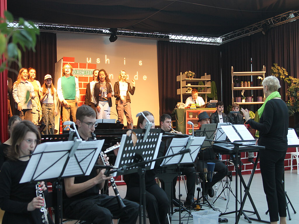 Und so sah das Publikum in der gut gefüllten Heinzenwies-Aula, wie Mr. Mushnik (Lasse Weinz) gerade seinen Blumenladen in der Skip Row schließt, nachdem er den ganzen Tag nicht mal eine Schachtel Kresse verkauft hat. Draußen lungern die Vorstadt-Kids (Leonie Jung, Elea Ruhk, Anna Hirsch, Nina Gerstenschläger, Chiara Lindemann) herum, die die Ereignisse im Blumenladen begleiten. Mushniks Angestellter Seymour (Jannis Ruhk) empfiehlt angesichts der trostlosen Lage Innovation und experimentiert mit einer neuen Pflanze, die er Audrey zwo nennt und die während einer totalen Sonnenfinsternis aufgetaucht ist. Audrey eins (Janina Lindemann) ist ebenfalls mit Seymour zusammen bei Mushnik angestellt. Seymour ist heimlich in sie verliebt, aber sie ist mit dem sadistischen Zahnarzt Orin Scrivello (Viktor Bäcker) zusammen, der auf seinem Roller durch die Heinzenwies-Aula tourt. Durch Zufall findet Seymour heraus, dass seine neue Pflanze Blut mag. Zunächst füttert er sie mit seinem eigenen Blut, die Pflanze beginnt zu wachsen und wird ein Hit. Plötzlich gelingt alles: Der Laden floriert und expandiert, Mushnik adoptiert Seymour, der auf einmal ein Star ist. Doch bald reicht sein eigenes Blut nicht mehr aus, ja, die Pflanze beginnt zu sprechen und verlangt bösartig nach Menschenblut. Großartig schauerlich lassen Tristan Engel und Janne Weinz die stetig größer werdende Audrey zwo immer heftiger nach Menschenblut verlangen. Gleichzeitig verspricht Audrey zwo dafür zu sorgen, dass Seymour alles bekommt, wonach er sich sehnt. Als Seymour sieht, wie Audrey von ihrem Zahnarzt-Freund misshandelt wird und sogar er selbst in dessen sadistische Fänge gerät, wirft er alle Skrupel von sich. Als dieser unter seiner Lachgasmaske erstickt, hilft er ihm nicht und verfüttert den Toten an Audrey zwo. Und das perfide Spiel geht weiter: Seymour wird berühmt, er gewinnt Audreys Herz und soll sogar eine eigene Fernsehsendung bekommen. Doch da kommt Mushnik Seymour auf die Schliche: Er hat rote Flecken auf dem Boden und den Arztkittel des spurlos verschwundenen Zahnarztes in der Mülltonne entdeckt. Nun drängt er seinen Adoptivsohn, sich der Polizei zu stellen. Seymour, verführt von seinem Erfolg, seiner Liebe zu Audrey und bedrängt von dem Ungeheuer, lässt sich korrumpieren: Er opfert Mushnik, den die Pflanze sofort verschlingt. Als auch eine Portion Rindfleisch von der Metzgerei Leyser als Zwischensnack die Pflanze nicht mehr zufrieden stellen kann, greift die Bestie nach Audrey. Seymour kann sie im letzten Moment noch aus dem Maul der mittlerweile riesigen Pflanze retten, doch sie stirbt. Vorher bittet sie Seymour noch sterbend darum, Teil der Pflanze zu werden. Diese entwickelt sich unaufhaltsam, lässt sich nicht mehr töten, verschlingt letztlich sogar ihren Pfleger Seymour und greift nach der Weltherrschaft. Nach Seymours Tod werden Ableger der Pflanze in alle Welt exportiert, ein großartiges Geschäft. Das ernüchternde Fazit: Gewalt und Gier greifen weltweit um sich und lassen sich nicht eindämmen.