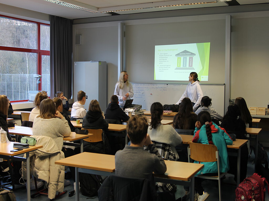 Wie wichtig das Thema „Nachhaltigkeit“ für jeden Einzelnen ist und dass auch jeder aktiv etwas dafür tun kann, zeigte das S.U.N.-Projekt des Umweltcampus Birkenfeld in dieser Woche den Siebtklässlerinnen und Siebtklässlern des Gymnasiums an der Heinzenwies. In zwei spannenden Unterrichtsstunden klärten Sophie Kaucher und Vanessa Notararigo vom Umweltcampus schülerorientiert über das vielschichtige Thema auf. Ziel sei eine gute Zukunft für uns alle. In einem Vortrag führten die Referentinnen zunächst vor Augen, wie wichtig es ist, den Klimawandel und seine Folgen wie Dürren, Hungersnöte, Hochwasser oder Artensterben zu bekämpfen. Sie erklärten den interessierten Schülerinnen und Schülern, dass es einen Weltklimarat gibt, der versucht den weltweiten Temperaturanstieg auf 1,5 °C zu begrenzen, und dass der Rat dazu 17 Sustainable Development Goals beschlossen habe. Auch die entscheidende Frage „Was kann ich tun?“ wurde gemeinsam erörtert. Es wurde deutlich, dass schon kleine Aktionen wie gebrauchte Kleider in Secondhandläden zu bringen, Nutella ohne Palmöl oder Gurken ohne Plastikverpackung zu kaufen zu einem Wandel beitragen. Schließlich wurde auch der wichtige Begriff der Biodiversität erklärt. Wenn es weniger Tiere und Pflanzen auf der Welt gibt, so befördert dies auch den Klimawandel. Umgekehrt macht Biodiversität Pflanzen widerstandsfähiger. Artenreiche Ökosysteme sind stabiler und können Störungen besser ausgleichen.