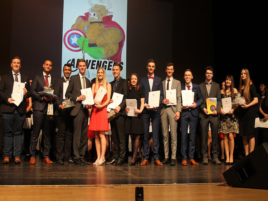 Die Glückwünsche der gesamten Schulgemeinschaft überbrachte Schulleiter Werner Lehnen, der mit dem Abiturjahrgang 2019 seinen letzten Abiturjahrgang verabschiedete, bevor er im Sommer in den Ruhestand geht. Und noch einmal war Christopher Smith, ein altbekanntes Heinzenwies-Bühnentalent, mit „Someone You Loved“ von Lewis Capaldi zu hören. Für das Kollegium nahm Studienrätin Christine Fell von den 63 Abiturientinnen und Abiturienten Abschied. Die Mathematik- und Physiklehrerin beschäftigte sich in ihrer Rede mit dem Phänomen der Zeit. Auch wenn ab dem 20. Mai 2019 eine Sekunde genau definiert sei als die Dauer von 9192631770 Schwingungen der Strahlung, die der Energie des Übergangs zwischen den zwei Hyperfeinstrukturniveaus des ungestörten Grundzustandes im 133Cs-Atom entspricht, sei Zeit letztlich etwas äußerst Subjektives. Die selbstgewählte Liedzeile „Und die Zeit war schön“ deute darauf hin, dass die Erinnerungen der Abiturienten an die Zeit auf der Heinzenwies positiv seien. Anschließend spielte Jennifer Rauschenbach am Klavier „Crazy in Love“, die Titelmusik des Films „Fifty Shades of Grey“. In der Elternansprache ließen Kerstin Ruppenthal und Jochen Pohl die Heinzenwiesjahre ihrer Kinder Revue passieren und gaben ihnen mit auf den Weg: „Sucht euch ein neues motivierendes Ziel mit eurem Abiturzeugnis im Gepäck. Freut euch auf die nächste Etappe!“. Das Ensemble um Clara Schwickert, Christopher Smith und Milena Gilcher, das auch schon am Abiturgottesdienst zu hören war, präsentierte „You and Me“ von „You + Me“, bevor Vanessa Vögel und Marvin Ballat in ihrer Rede das Motto des Jahrgangs „Abivengers – die Helden von morgen“ genauer unter die Lupe nahmen. So spiegele der Stier, der auch die Abizeitung ziere und das Maskottchen der Schule sei, die Stufe wider. Die Oberstufenzeit hätten sie als eine der schönsten Zeiten erlebt und würden sie jetzt schon vermissen.