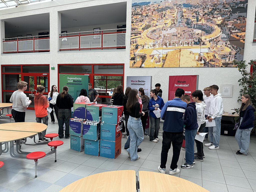 Die in der Aula des Gymnasiums an der Heinzenwies für drei Wochen ausgestellte Wanderausstellung „Demokratie stärken - Rechtsextremismus bekämpfen“ der Friedrich-Ebert-Stiftung zeigt die Bedeutung der Demokratie für die Gesellschaft auf und thematisiert die Gefahr, die vom Rechtsextremismus für Demokratie und Menschenwürde ausgeht. Um ihre Mitschüler_innen durch die Ausstellung führen zu können, lernten acht Schülerinnen und Schüler in einem Peer-to-Peer-Workshop den Inhalt der Ausstellung kennen und wurden dazu ausgebildet, als Ausstellungsbegleiter_innen fungieren zu können: „Als wir am Dienstagmorgen in der Aula eintrafen, begrüßten uns sowohl zwei Vertreter der Stiftung als auch eine bereits aufgebaute Ausstellung bestehend aus Textstelen und einem Medientisch. Die ersten Stunden verbrachten wir zunächst damit, unsere bereits vorhandenen Kenntnisse aufzufrischen und die neuen Informationen zu sammeln. Nachdem wir einmal selbst eine Führung durch die Ausstellung erhielten, übten wir für den Rest der Zeit das eigenständige Präsentieren an den Stelen. In den darauffolgenden Tagen und der nächsten Woche begleiteten wir einzelne Klassen und Kurse durch die Ausstellung und vermittelten ihnen die Erkennungsmerkmale von Rechtsextremismus, den Unterschied zum Rechtspopulismus und das Erkennen der von rechtsextremen Gruppen genutzten Propagandamethoden, die häufig auf Jugendliche abzielen. Anschließend sprachen wir gemeinsam über die Demokratie; was Demokratie für uns bedeutet, wo sie uns im Alltag begegnet und was sie genau ausmacht.“